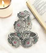 Set of 2 silver oxidised cuff bangles studded with pink and green stones. Secured with cuff closure.