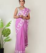Aakar Purple Handloom Cotton Saree With Delicate Handcrafted Floral Art