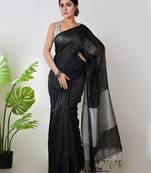 Aakar Black Handloom Linen Saree With White Zari Stripe