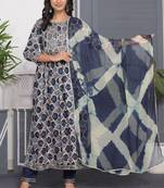Navy Blue Embroidered Women Rayon Printed Aline Kurta Pant With Dupatta Set