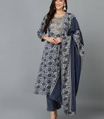 Pick this silk blend-blend dress for any casual or formal occasion. This grey-colored floral printed kurta has a round embroidered neckline adorned with frontal buttons. It has three-quarter sleeves, a straight hemline, and comfy side slits. It is paired with vertically striped straight trousers having a pocket and side slits. A silk blend blend blue-colored printed dupatta spruces up the look.