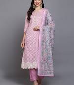 Embrace a feminine energy that surrounds you by sporting this pink colored suit set crafted from cotton fabric. The printed kurta features a round embroidered neckline with three-quarter sleeves. It has a hemline adorned with embroidered hemline with side cutouts. It is paired with straight bottoms designed with a pocket and a half elasticated waistband. The outfit comes with a printed dupatta for a complete look.