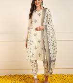 Women Cream Pure Cotton Ethnic Motifs Printed Straight Kurta Trouser With Dupatta