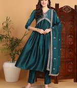 Women Green Silk Blend Solid Embroidered A Line Kurta Trousers With Dupatta