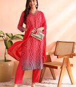 Women Red Rayon Blend Bandhani Printed Straight Kurta Trousers With Dupatta