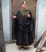The captivating saanjh black anarkali ensemble is a perfect choice for sophisticated elegance. The quilted yoke adds a unique and luxurious texture, elevating the overall appeal. Adorned with intricate gold laces, it exudes an air of elegance and enduring beauty. The set includes a matching dupatta that drapes gracefully, and a churidar that adds a classic touch. Handmade tassels delicately sway, adding an artisanal touch to the ensemble. Step into any occasion with confidence and grace with this black anarkali embodies the perfect blend of contemporary style and traditional allure.