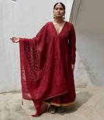 The exquisite aria wine anarkali ensemble is a harmonious fusion of sophistication and allure. The v-neck design and meticulously crafted pin tuck detailing lend an elegant touch, while the intricate gold laces add a touch of luxury. Handmade tassels delicately sway, showcasing the artistry infused into every detail. The set includes a matching dupatta that gracefully drapes, and a churidar that accentuates your silhouette with its classic charm. Embrace the enchantment of any occasion as this wine anarkali epitomizes timeless sophistication and captivating elegance.