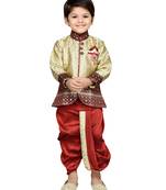 • Product Id : 2746895 • Package Details : 1 Kurta / 1 Dhoti • Type : Kids Dhoti Kurta • Occasion : Festive • Fabric : Art Silk,Cotton Silk • Look : Traditional • Bottom Color : Maroon • Top Color : Gold • Work : Jacquard • Bottom Style : Dhoti • Gender : Boy Payments [+]