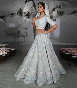 Enveloped between mint blue hues and intricate handwork lies this azul lehenga. Featuring a mint blue lehenga embroidered with hand done doori work by our in-house artisans. It's paired with a mint blouse embellished with matching doori and swarovski work. To bring the outfit together, we have a trail dupatta with a graceful lace border making it perfect for that grand entrance.we can customise the outfit in any colour and with any blouse design.