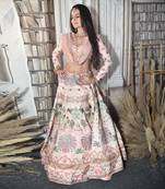 Enveloped between geometric and floral motifs lies this pink paradise lehenga. The digitally printed pink lehenga is embellished with an embroidered belt with the brand's logo in the center. The blouse is embroidered with gold kasab embroidery completed with mirror work. The outfit is further paired with a dupatta and a waist belt to complete the look. We can customize the outfit colour and the blouse design for you.