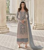 This grey salwar suit is crafted with soft net fabric and features detailed thread embroidery that adds a graceful touch to the outfit. The top comes in a semi-stitched form with a round neckline and full sleeves, making it suitable for formal events and wedding functions. It includes a matching palazzo-style bottom made from net and a beautifully embroidered net dupatta to complete the look. The satin lining ensures comfort and gives a neat, finished fall to the outfit.