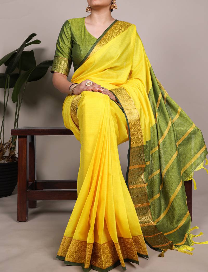 • Saree : Color- Yellow / Fabric- Poly Cotton • Blouse : Color- Mehandi Green / Fabric- Poly Cotton Saree Details