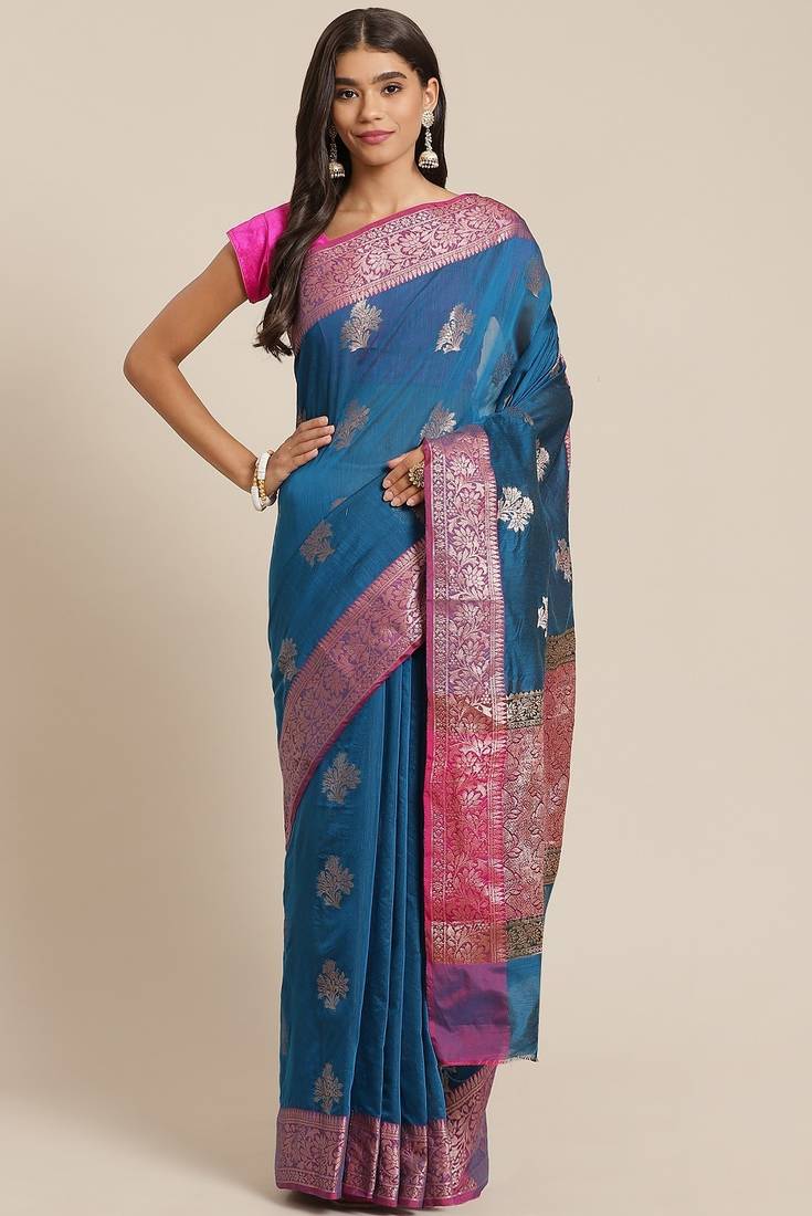 If you find the product for less we'll match it! Know More• Saree : Color- Blue / Fabric- Silk Blend • Blouse : Color- Pink / Fabric- Silk Blend Saree Details