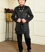 Boys Satin Geometric Sequined Embroidered Sherwani Set Black