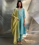 Step into the opulence of Cleopatra's reign with this stunning powder blue kurta set. The kurta boasts intricate embroidery on the front yoke, accentuated by vibrant edge detailing. Accompanied by an embroidered dupatta with contrasting color panels and adorned with gold-polished hangings, this set radiates regal elegance and timeless sophistication, embodying the grace and poise of a queen.