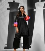 Elevate your wardrobe with enchantment and style in this black satin kurta palazzo set. The V-neckline and three-quarter flared sleeves effortlessly enhance your silhouette, while the striking colourblocked cuffs add a touch of modern elegance. With the tone-on-tone solid palazzo for a seamless ensemble, this satin set is a must-have for those who appreciate luxe fashion with a contemporary twist.