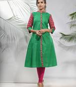 Upgrade your wardrobe with the elegant charm of this green cotton solid A-line kurta. Crafted from cotton , this chic kurta features a classic mandarin nackline and a button placket for a sophisticated look. The printed three quater sleeves add a touch of grace, making it perfect for any occasion. The delightful solid green enhances the kurta's femininity, while the flattering A-line silhouette drapes beautifully on all body types. Embrace comfort and style effortlessly with this timeless piece that exudes an aura of poise and glamour.