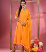 If fashion were a language, this yellow georgette gathered suit set would be a sartorial masterpiece. With its V neckline and half sleeves, this ensemble screams elegance from every stitch. The gathered empire line adds just the right amount of flair and gives you that regal look fit for a queen. The Alia-cut design looks exquisite. The faux mirror detailing adds a touch of intricacy and charm, making heads turn wherever you go. Paired with a sleek straight pant and a dupatta, this ensemble is a symphony of grace.