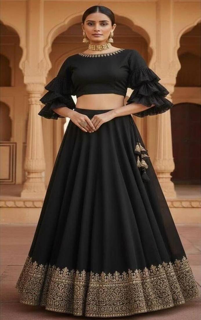 • Style : Circular Lehenga • Fabric : Georgette • Color : Black • Work : Embroidered Dupatta Details