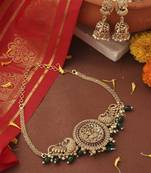 Elevate your ethnic style with this exquisite choker set featuring a stunning round peacock motif. Crafted with intricate detailing, the choker beautifully showcases the elegance and grace of the peacock, making it a perfect accessory for weddings, festivals, or special occasions. The set includes matching earrings that complement the choker, adding a harmonious touch to your overall look. Designed for comfort and style, this choker set is a timeless addition to your jewelry collection, celebrating traditional artistry while enhancing your attire with a regal flair.
