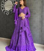 Make a bold statement with this Purple Party Wear Lehenga Choli. This lehenga choli set features a semi-stitched lehenga crafted from faux georgette, adorned with intricate thread embroidery that adds a touch of glamour. The lehenga boasts a generous flair of 3.50 meters with a can-can for added volume. A matching dupatta and an unstitched faux georgette blouse with full sleeves and a V-neck accompany this threadwork embroidered party wear lehenga choli.