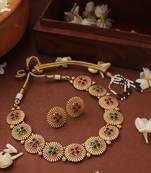• Product Id : 4468520 • Package Details : 1 Necklace / 1 Pair Of Earrings • Type : Necklace Sets • Look : Traditional • Jewellery Work : Gold Plated • Color : Gold • Plating : Yellow Gold • Base Material : Alloy Payments [+]
