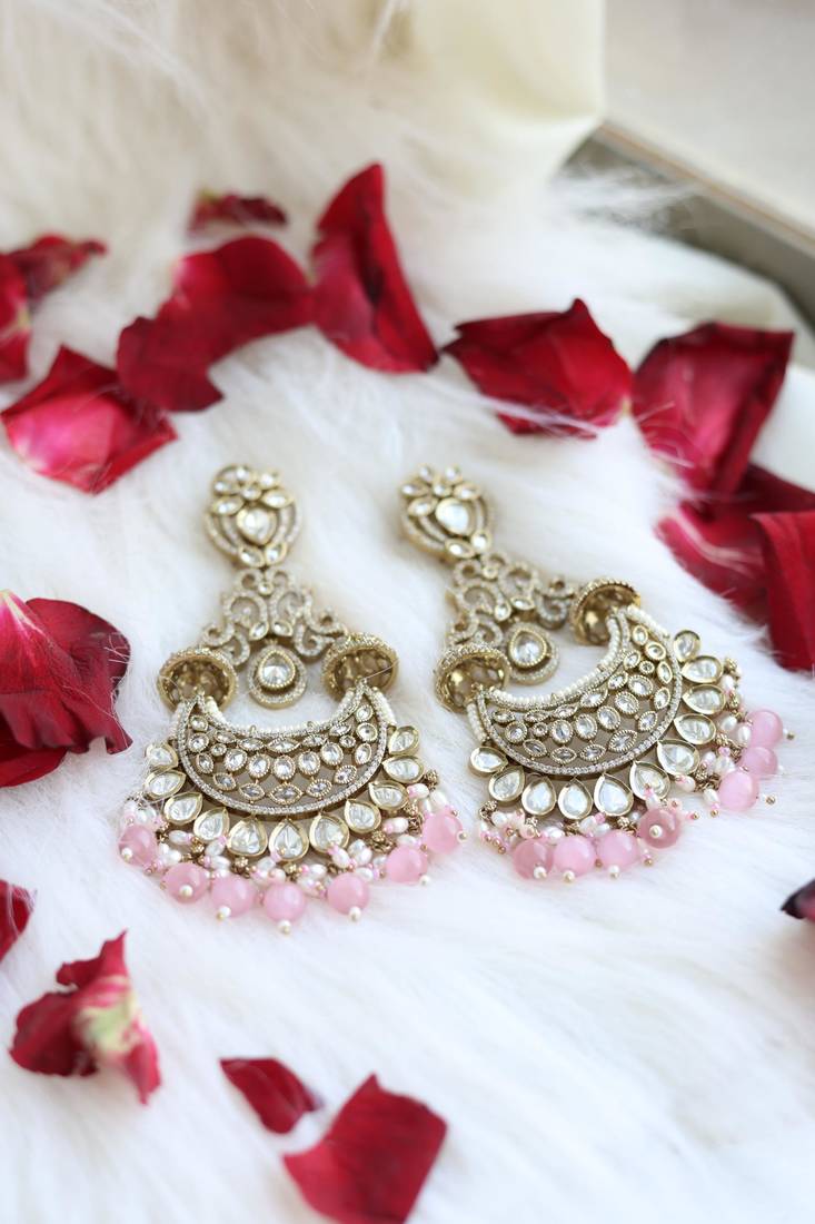 Celebrate tradition with these magnificent Gold Plated Chandbalis, adorned with soft pink gemstone beads. The classic crescent moon shape is filled with intricate lattice work and sparkling crystals, capturing the essence of Bollywood fashion. These festive earrings are essential for Sangeet nights and joyful wedding celebrations.