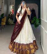 This elegant stitched lehenga in poly cotton features a classic chex pattern with zari weaving, offering a graceful 3.5-meter flair and micro cotton lining for comfort. The set comes with an unstitched blouse in matching fabric and a stylish georgette dupatta adorned with a weaving lace border. Perfect for festive and traditional occasions, it combines timeless charm with effortless wearability.