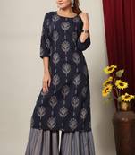 True magnificence comes out of your dressing design with this Blue colored casual wear Kurti Sharara Set . This kurit Sharara Set is fashioned on pure cotton which is lightweight and assures the wearer a perfect fit & comfort. This stitched kurti beautified with floral printed work with latest trend & fashion as shown. Ideal for casual wear, family functions, outing & weekend get together. Pair it up with heels & stylish accessories. This attractive long kurti will surely fetch you compliments for your rich sense of style. Note:- The actual product may differ slightly in color and design from the one illustrated in the images when compared with computer or mobile screen.