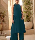 Teal Blue Halter Neck Kurta And Culottes Set With Front Pocket