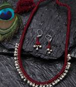 Category of jewellery is necklace set; sub category is haar; ideal for women; base color is red; short description is handcrafted red thread neck pc highlighted iwth 92.5 sterling silver ghungru.; gemstones used - na; plating is silver-plated; base metal is silver; other material used - ; size is freesize; adjustable - yes; weight is 22 gms; mesaurements - length of earring= 3.7 cm; width of earring =1.5 cm; length of necklace =28.3 cm; width of necklace = 56 cm; content.