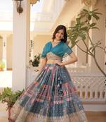 Glamorous Blue Russian Silk Rich Digital Printed With Foil Embroidered Work Lehenga Choli For Wedding