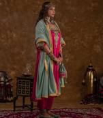 This Exquisite Ensemble Features A Striking Hot Pink Base Adorned With A Rich Sea Green Patch, Meticulously Hand-Embroidered With Delicate Coin Work. The Suit Set Comes With An Elasticated Salwar For Comfort And Practicality, Along With Thoughtfully Added Pockets. The Contrasting Velvet Patch Adds A Luxurious Touch, Complemented By A Velvet Odhni Adorned With Hand-Picked Kiran Lace, Completing The Look With Finesse.