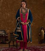 This Exquisite Ensemble Features A Striking Hot Pink Base Adorned With A Rich Teal Blue Patch, Meticulously Hand-Embroidered With Delicate Coin Work. The Suit Set Comes With An Elasticated Salwar For Comfort And Practicality, Along With Thoughtfully Added Pockets. The Contrasting Velvet Patch Adds A Luxurious Touch, Complemented By A Velvet Odhni Adorned With Hand-Picked Kiran Lace, Completing The Look With Finesse.