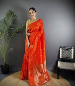 Enhance your ethnic wardrobe with the Elora Red Silk Banarasi Saree, designed for women who admire heritage with sophistication. Pair it with gold jewelry for a regal look. Shop this premium Banarasi zari weaving saree online to stand out at weddings, festivals, and special occasions.