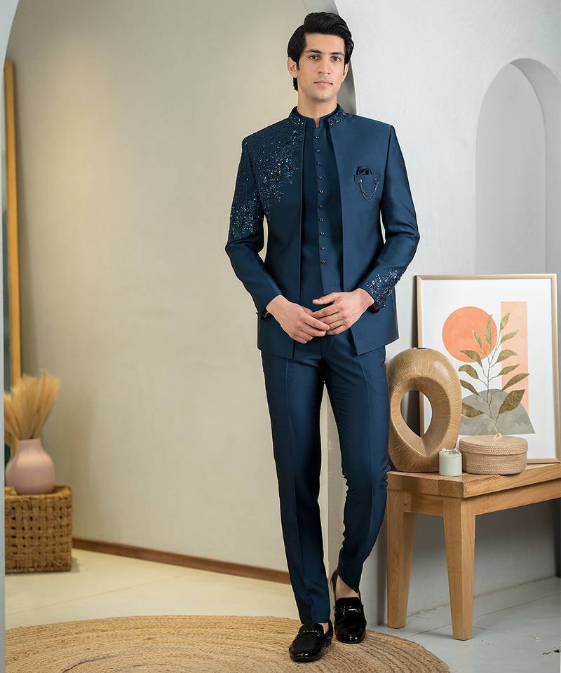 Distinguished blue Jodhpuri suit featuring intricate floral hand embroidery on the shoulder, sleeve and collar. Ideal for Sangeet, Weddings, Receptions, and special occasions for a statement look.