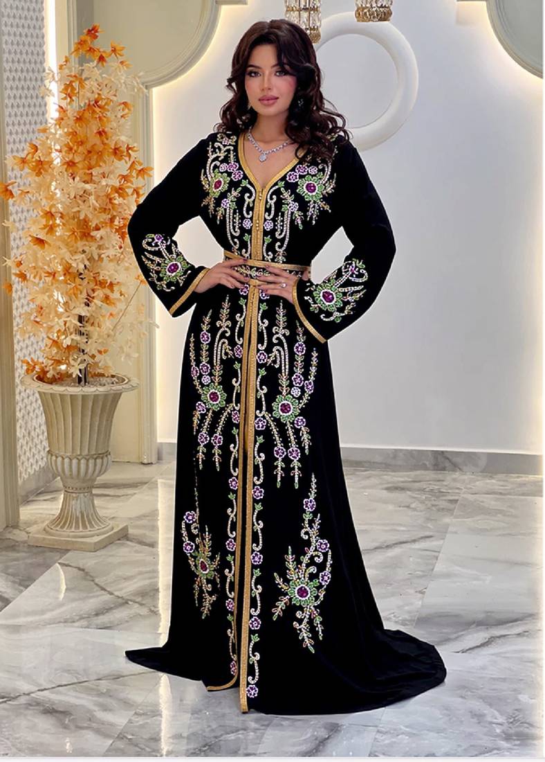 Luxury black color full sleeves Moroccan Kaftan, this luxurious design that's sure to turn heads, this kaftan dress flows over curves and boasts an ornate embellished design with colors beads, and beautiful crystal stones.