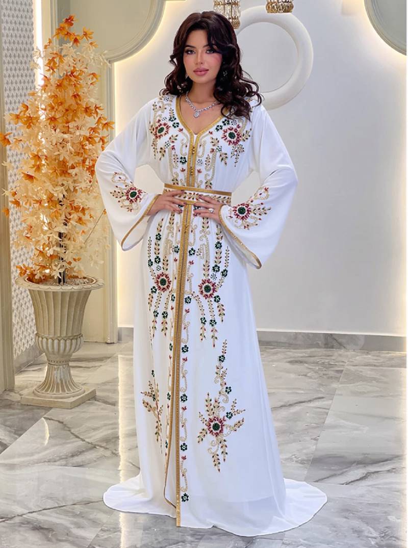 Luxury Off-White color full sleeves Moroccan Kaftan, this luxurious design that's sure to turn heads, this kaftan dress flows over curves and boasts an ornate embellished design with colors & beads, and beautiful crystal stones.