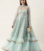 Presenting a blue net embroidered gown, features collar neckline both in front and in the back, the front has keyhole detailing along with a loop and potli ball opening on the collar, sheer full sleeves, yoke until natural waist, embroidered full circular flare until knee length, followed by two layers of plain mint green net gathered flare from knee to calf and calf to floor-length with beige gold borders at the hemline. The gown has side zip closure. Cancan is preferred for voluminous flare. This set comes along with a non-medical lifestyle blue net embroidered mask with elastic..
