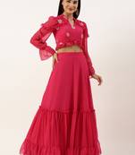 Ethnovog Ready To Wear Dark Pink Embroidered Georgette Crop Top N Skirt Set
