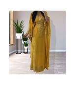 Fabric & Design: This exquisite mustard yellow kaftan is crafted from high-quality georgette, known for its lightweight and flowy nature. The elegant design features intricate zari embroidery that adds a touch of sophistication and charm. The rich mustard hue, reminiscent of vibrant haldi ceremonies, makes it a perfect choice for celebratory occasions.