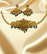 Elevate your traditional ensemble with the GG Antique Temple Peacock Jewelry Set, an exquisite combination of regal design and cultural elegance. This gold-toned set features intricate temple motifs, highlighted by majestic peacocks and goddess detailing. Embellished with rich green bead droplets, classic white pearls, and red stone accents, the set exudes royal charm. Ideal for weddings, festivals, and heritage celebrations, each piece is finished with a premium anti-tarnish coat to maintain its luster over time. A perfect fusion of tradition and luxury.