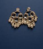 Elevate your ethnic and festive look with these exquisite gold-plated hoop chandelier earrings. Featuring a stunning arrangement of sparkling white stones in round and teardrop shapes, each bordered with delicate micro-crystals, these earrings exude elegance and charm. Dangling white pearl beads add a graceful touch, making them perfect for weddings, parties, and traditional celebrations. Lightweight yet eye-catching, these earrings blend timeless design with contemporary appeal for the modern woman.