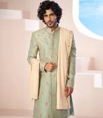 • Product Id : 4499547 • Package Details : 1 Sherwani ,1 Trouser,1 Duppata • Type : Sherwani • Fabric : Dupion • Work : Printed • Look : Traditional • Sleeve : Full Sleeve • Color : Olive • Top Color : Green • Top Fabric : Dupion Silk • Stitching : Stitched Payments [+]