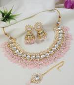 • Product Id : 4272347 • Package Details : 1 Necklace/1 Pair Of Earring/1 Maang Tikka • Type : Chokers • Look : Traditional • Jewellery Work : Kundan • Color : Pink • Plating : Yellow Gold • Base Material : Alloy • Pearl Type : Na • Pearl Shape : Na Payments [+]