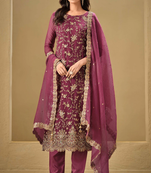 • Product Id : 4535255 • Package Details : 1 Top/1 Bottom/1 Dupatta • Type : Pakistani Dresses Salwar Kameez & Suits • Work : Embroidered • Look : Designer • Sleeve : Full Sleeve • Stitching : Unstitched • Fabric : Silk • Color : Magenta Stitching [+]