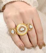 Embrace Delicate Enchantment With Our Polki Ring, A True Work Of Art Delicately Plated In 22Kt Gold Plated Brass. The Ethereal Placing Of Fresh Water Pearls Adds A Touch Of Poetry To This Unique Piece, Making It A Symphony Of Sophistication And Style.