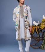 This outfit is a striking traditional ensemble in an elegant Blue hue, featuring a beautifully embroidered kurta jacket that blends cultural artistry with contemporary charm. The intricate embroidery is a vibrant mix of motifs, including leopards, architectural elements, musical instruments, and everyday objects, creating a storytelling effect on the fabric. The detailed borders add a refined touch, enhancing the regal appeal of the ensemble. Paired with a matching ivory kurta and tailored trousers, the look is both sophisticated and artistic. The combination of heritage craftsmanship and modern whimsy makes this outfit perfect for special occasions, embodying a unique blend of tradition and creativity.