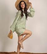 This women’s green and white textile print cotton co-ord set is a fresh and trendy addition to your wardrobe. The shirt features a classic collar neckline and full sleeves, providing a stylish yet comfortable fit. Made from soft, breathable cotton, it ensures comfort all day long. Paired with matching shorts, the set creates a coordinated, playful look, perfect for casual outings. Ideal for warm weather, this co-ord set is both chic and versatile.