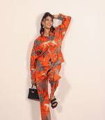 This women’s orange and multi-colored printed cotton co-ord set brings a bright and bold touch to your wardrobe. The shirt features a classic collar neckline with full sleeves, offering a chic and comfortable fit. Made from soft, breathable cotton, it ensures comfort throughout the day. The matching pants, with a coordinating vibrant print, complete the set for a stylish, coordinated look. Perfect for casual or semi-formal events, this co-ord set is a lively and fashionable choice.